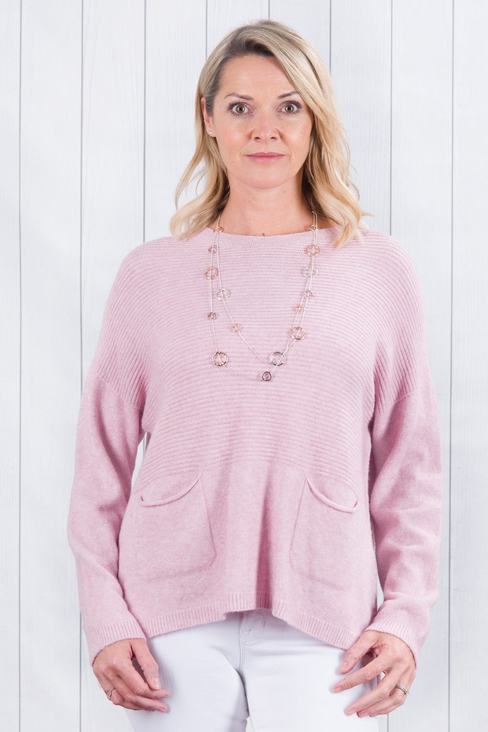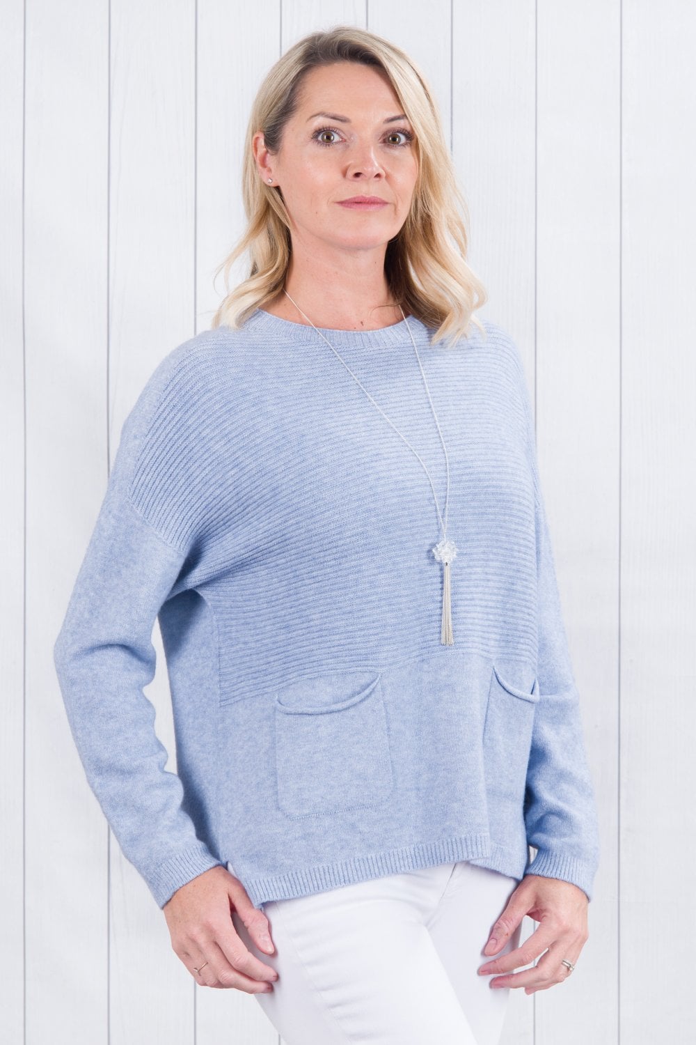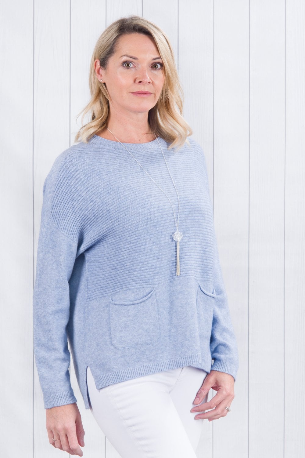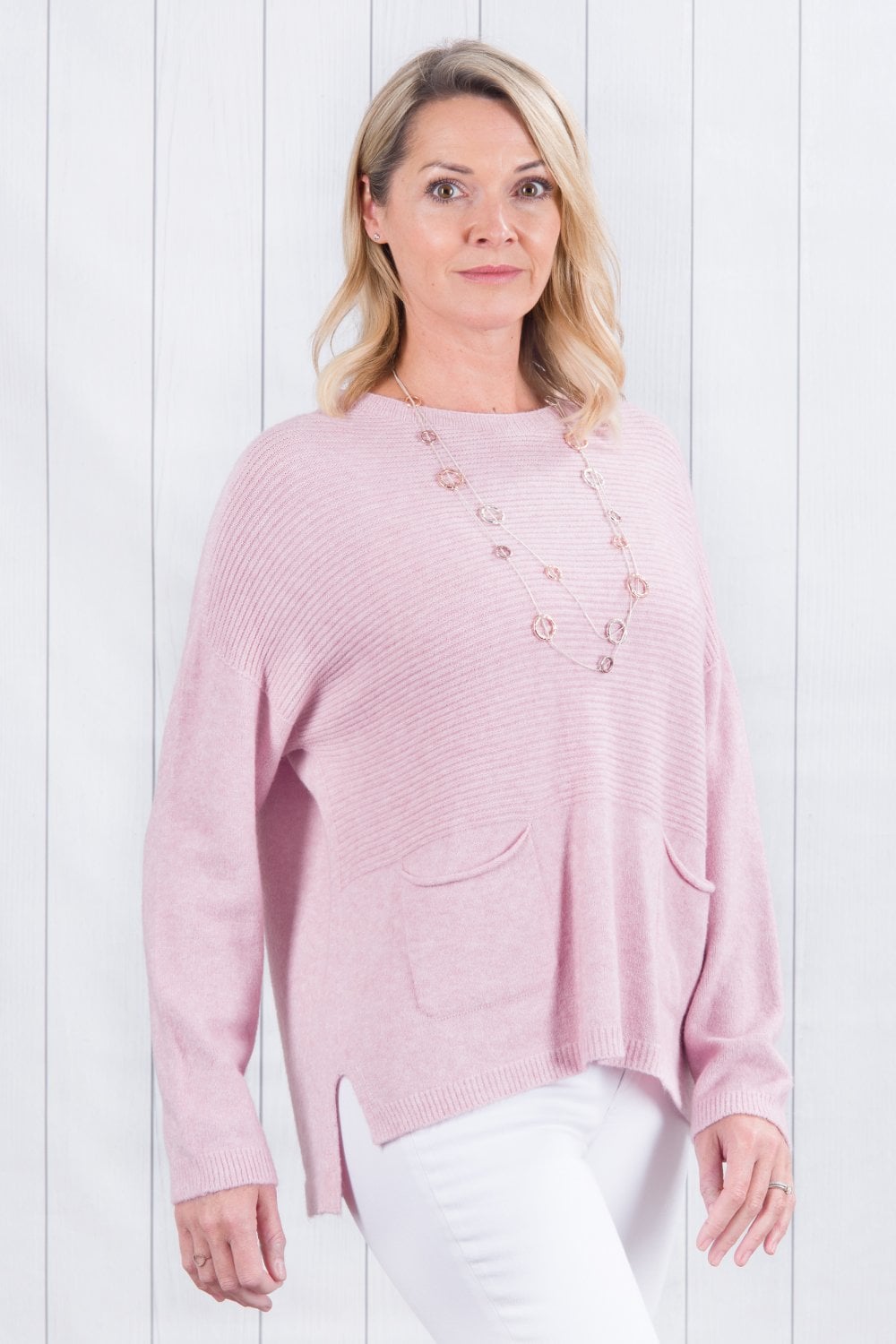 Our Amelia ribbed jumper with two pockets at the front, is both stylish and casual. A really great loose fitting jumper, wear layered with a shirt and scarf or on its own. A good length to wear everyday with jeans and trainers, boots or pumps. A casual fitting jumper that can be dressed up or down. A very flattering loose shape. A wonderful addition to your wardrobe. Wear it daytime or evening. We love to wear ours with our shirt collar Mandy. It's super soft and cosy!!